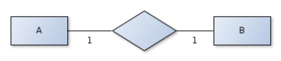 - Bei einer 1-1-Relation ist jedem Element der Entitätsmengen A ein Element der Entitätsmengen B zugeordnet und jedem Element der Entitätsmenge B das entsprechende Element der Entitätsmenge A. Es handelt sich also um eine eineindeutige Zuordnung.