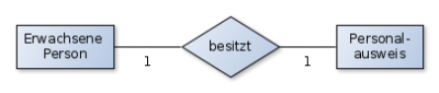 - Ein Beispiel für eine 1-1-Relation ist die Beziehung „besitzt“ zwischen der Entitätsmenge „Erwachsene Person“ und der Entitätsmenge „Personalausweis“. Jede Person besitzt genau einen Personalausweis und zu einem Personalausweis gehört genau eine Person.