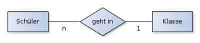 - Ein Beispiel für eine n-1-Relation ist die Beziehung „lernt in“ zwischen der Entitätsmenge „Schüler“ und der Entitätsmenge „Klasse“. Ein Schüler lernt in genau einer Klasse. In einer Klasse lernen mehrere Schüler.