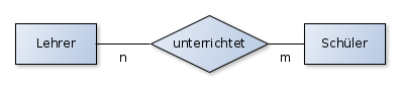 - Ein Beispiel für eine für eine n-m-Relation ist die Beziehung „unterrichtet“ zwischen den Entitätsmengen „Lehrer“ und „Schüler“. Ein Lehrer unterrichtet mehrere Schüler und ein Schüler wird von mehreren Lehrern unterrichtet.