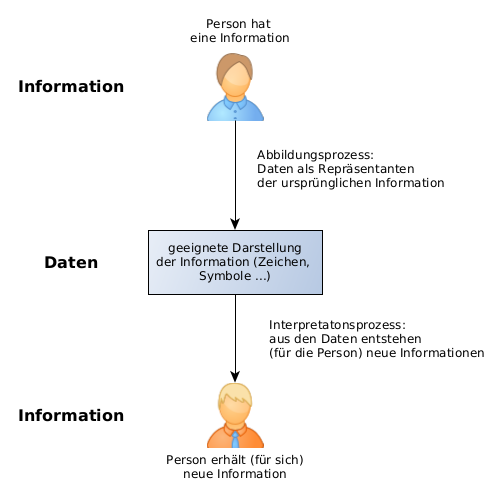 Informationen können nicht einfach ausgetauscht werden. Sie müssen zunächst in in geeignete Form (Daten) gebracht werden. Diese Daten nennt man dann Repräsentant (Stellvertreter) der ursprünglichen Information. In dieser Form werden sie dann weitergegeben und interpretiert. Das folgende Schema stellt den Prozess dar.