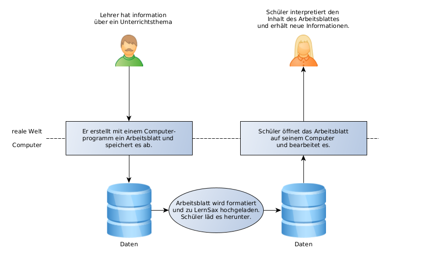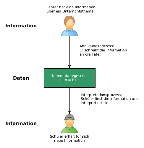Auch in Informatiksystemen findet dieser Informationsverarbeitungsprozess statt. Hier werden die Informationen mit Hilfe von Anwendungsprogrammen vom einem Nutzer aus der realen Welt in eine für den Computer lesbare (digitale) Form gebracht (abgebildet) und auf Speichermedien (Festplatte, USB-Stick …) abgespeichert. Diese Daten können nun im Datenverarbeitungsprozess für weitere Anwendungsprogramme nutzbar gemacht werden bzw. können Sie auch über Netzwerke weitergegeben werden. Die weiteren Anwendungsprogramme bereiten die Daten dann so auf, dass sie von Personen in der realen Welt wahrgenommen. Diese Personen interpretieren die Darstellung und erhalten dadurch für sich neue Informationen.
