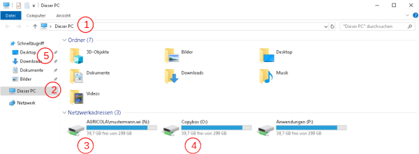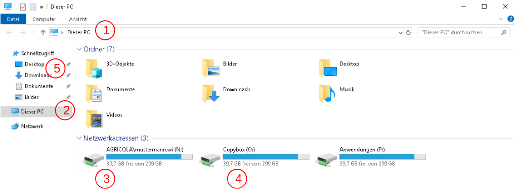 (1) Adressleiste, (2) Dieser PC, (3) Persönliches Laufwerk, (4) Copybox, (5) Download-Ordner