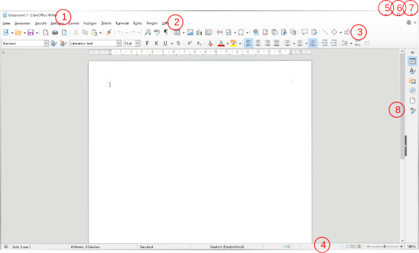 (1) Titelleiste, (2) Menüleiste, (3) Symbolleiste, (4) Statusleiste,