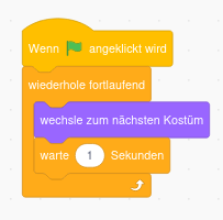 Wir wollen ein Programm schreiben in dem eine Figur tanzt. Wähle eine geeignete Figur und einen geeigneten Hintergrund (z.B. Cassy Dance (Größe 70) und Spotlight). Die Figur soll nun ihr Kostüm wechseln, damit es aussieht, als ob sie tanzt. Dazu wurde das folgende Programm mit einer Zählschleife geschrieben: