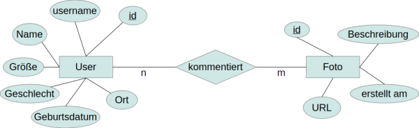 $\text{User} \left(\underline{\text{id}}, \text{username}, \text{Name}, \text{Größe}, \text{Geschlecht}, \text{Geburtsdatum}, \text{Ort}\right.$ $\text{Foto} \left( \underline{\text{id}}, \text{Beschreibung}, \text{erstellt_am}, \text{URL} \right.$