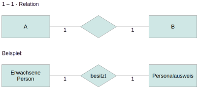 Ein Beispiel für eine 1-1-Relation ist die Beziehung „besitzt“ zwischen der Entitätsmenge „Erwachsene Person“ und der Entitätsmenge „Personalausweis“. Jede Person besitzt genau einen Personalausweis und zu einem Personalausweis gehört genau eine Person.