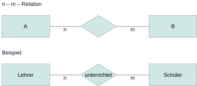 Ein Beispiel für eine für eine n-m-Relation ist die Beziehung „unterrichtet“ zwischen den Entitätsmengen „Lehrer“ und „Schüler“. Ein Lehrer unterrichtet mehrere Schüler und ein Schüler wird von mehreren Lehrern unterrichtet.