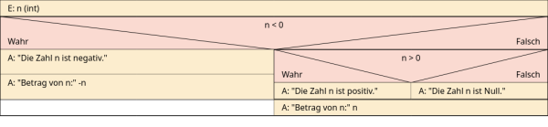 Wir wollen nun unser Beispiel erweitern. Nachdem wir festgestellt haben, dass die Zahl nicht negativ ist, soll noch festgestellt werden, ob die Zahl Null ist, oder ob die Zahl positiv ist. Im Struktogramm könnte der Algorithmus so aussehen: