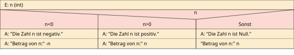 s ist ein Programm zu erstellen, dass nach Eingabe einer ganzen Zahl entscheidet, ob die Zahl negativ oder nichtnegativ ist. Zusätzlich soll der Betrag der Zahl ausgegeben werden.