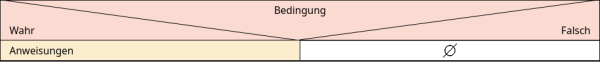 Das Struktogramm ist zunächst genau so aufgebaut, wie bei der Verzweigung ohne Alternative. Im Unterschied zu Verzweigung ohne Alternative stehen jetzt unter dem rechten Dreieck die Anweisungen, die ausgeführt werden, wenn die Bedingung nicht erfüllt ist bzw. wenn die Frage mit nein beantwortet wird.