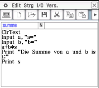 ClrText Input a,"a=" Input b,"b=" a+b⇒s Print "Die Summe von a und b ist:" Print s