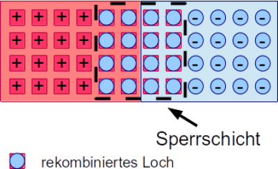 Elektronen der n-leitenden Schicht rekombinieren die Löcher der p-leitenden Schicht, eine Sperrschicht entsteht. Es bildet sich ein elektrisches Feld. Dieses Feld verhindert ein weiteres Rekombinieren.