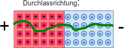 Der Minuspol überschwemmt die n-leitende Schicht mit Elektronen und presst sie in die Sperrschicht. Der Pluspol saugt Elektronen aus der p-leitenden Schicht ab. Ab einer Spannung von 0,7 V ist das elektrische Feld und damit die Sperrschicht aufgehoben, es kommt zum Stromfluss