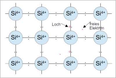 Halbleiteratome haben vier Außenelektronen, die mit den Nachbaratomen jeweils feste Elektronenpaare bilden. Durch Energiezufuhr können sich einige Elektronen aus der Atombindung lösen und hinterlassen Löcher. Löcher und Elektonen wirken als frei bewegliche Ladungsträger. Damit ist elektrische Leitung möglich.