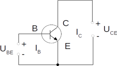- Wenn nur $U_{BE}$ anliegt, fließt der Strom $I_B$, da der Übergang B-E in Durchlassrichtung geschalten ist.