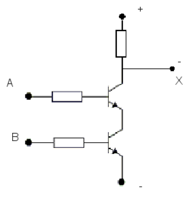Aus Transistoren lässt sich ein NAND-Gatter konstruieren: