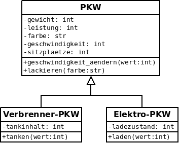 In Python definiert man eine abgeleitete Klasse indem man in der Definition hinter dem Klassennamen den Klassennamen der Elternklasse in Klammern Schreibt, also z.B. class VerbrennerPKW(PKW).