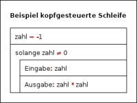 Bei der kopfgesteuerten Schleife wird die Schleifenbedingung am Anfang der Schleife getestet. Die Schleife wird immer wieder durchlaufen, solange die Bedingung erfüllt ist. Wenn die Bedingung beim Eintritt nicht erfüllt, wird die Schleife nicht durchlaufen.