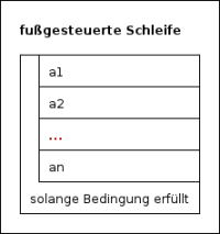 Bei der fußgesteuerten Schleife wird die Schleifenbedingung am Ende der Schleife getestet. Die Schleife wird immer wieder durchlaufen, solange die Bedingung erfüllt ist. Wenn die Bedingung beim Eintritt nicht erfüllt, wird die Schleife mindestens einmal durchlaufen.