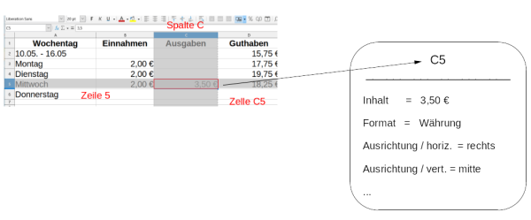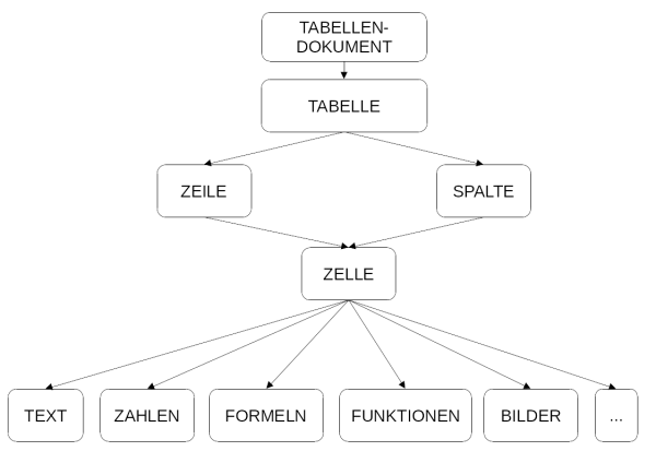 Eine Tabelle besteht Zeilen, die mit Zahlen nummeriert werden und aus Spalten, die nach dem Alphabet mit Buchstaben bezeichnet werden. Wo sich Zeile und Spalte treffen befindet sich eine Zelle. Eine Zelle wiederum kann verschiedene Objekte enthalten, z.B. Text, Zahlen, Bilder, Grafiken, Formeln, … Die Zelle ist das wichtigste Objekt in einem Tabellenkalkulationsprogramm.
