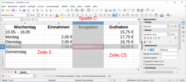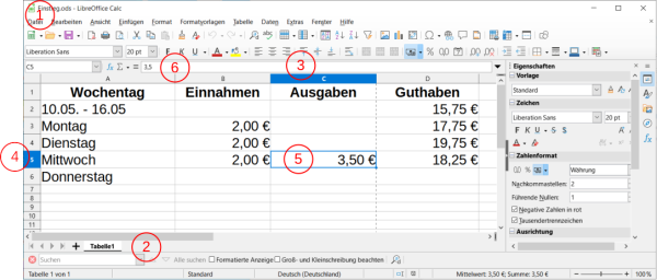Der Stand des Taschengeldkontos soll in einer Tabelle dargestellt und nach jeder Eingabe aktualisiert werden. Öffne dazu die Datei 01-2-aufgabe_taschengeld.ods und vervollständige die Tabelle.