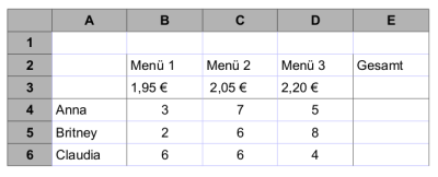 In der Tabelle oben werden die verzehrten Speisen und Getränke der 5 Angestellten eines Lokals erfasst. In die Zelle D5 wird die Formel