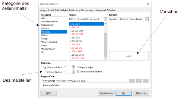 Der Inhalt einer Zelle lässt sich entsprechend der Art des Inhalts formatieren. Das entsprechendee Menü erhält man durch Rechtsklick auf die Zelle → Zellen formatieren. Alternativ kann man zum Formatieren die rechte Seitenleiste benutzen.