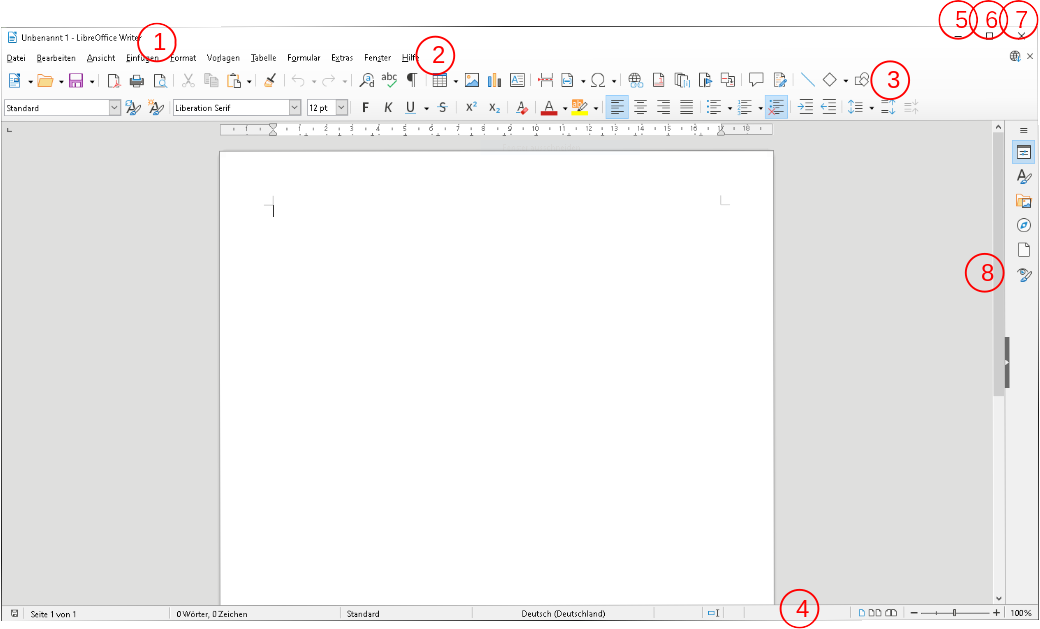 (1) Titelleiste, (2) Menüleiste, (3) Symbolleiste, (4) Statusleiste,