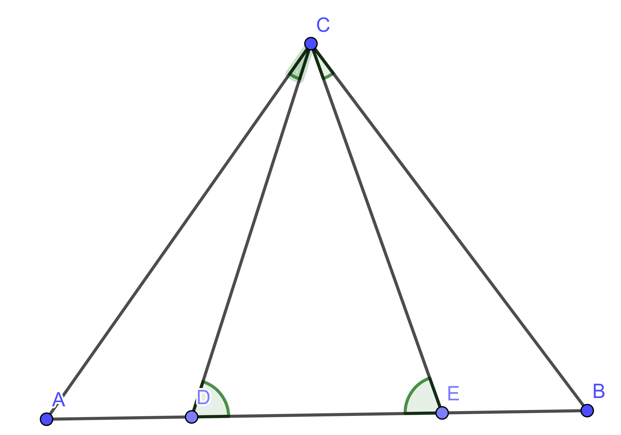 Es sei ABC ein gleichschenkliges Dreieck mit $\overline{\text{AC}}=\overline{\text{BC}}$ , auf dessen Basis $\overline{\text{AB}}$ zwei Punkte D und E (in der Reihenfolge A, D, E, B) so liegen, dass $\angle \text{ACD}= \angle \text{ECB}$ gilt. Verändere die Figur. Welche Vermutung lässt sich über die Winkel $\angle \text{EDC}$ und $\angle \text{CED}$ treffen? Beweise die Vermutung!