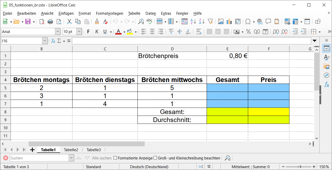 Erstelle die Datei 02_uebung1 und speichere sie in deinem Verzeichnis! (Siehe Abbildung!) Berechne Peters Brötchenanzahl und den Preis, den er bezahlen muss (blaue Zellen)!