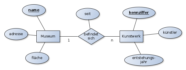 Insgesamt sind zwei Entitätsmengen zu betrachten „Museum“ und „Kunstwerk“. Für die Entitätsmenge „Museum“ ist das Attribut name als Primärschlüssel geeignet, für die Entitätsmenge „Kunstwerk“ das Attribut kennziffer. Zwischen den beiden Entitätsmengen besteht die Relation „befindet sich“ mit dem Attribut seit. Da sich ein Kunstwerk in nur einem Museum befinden kann und sich in einem Museum mehrere Kunstwerke befinden ist die Relation vom Typ n zu 1.