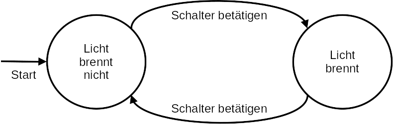 Die Lampe kennt zwei Zustände: „Licht brennt.“, „Licht brennt nicht.“. Eine Zustandsänderung kann man auslösen, indem man den Schalter betätigt. „Den Schalter betätigen.“ ist sozusagen eine Eingabe die eine Zustandsänderung (einen Zustandsübergang) auslöst. Damit ergibt sich die folgende Grafik als Automat:
