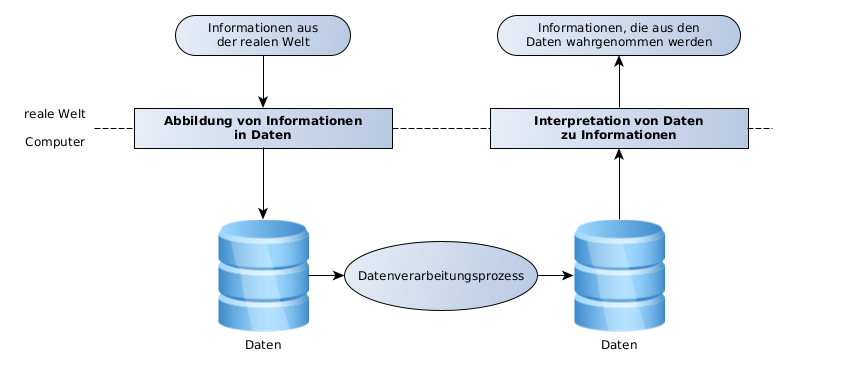 Auch in Informatiksystemen findet dieser Informationsverarbeitungsprozess statt. Hier werden die Informationen mit Hilfe von Anwendungsprogrammen vom einem Nutzer aus der realen Welt in eine für den Computer lesbare (digitale) Form gebracht (abgebildet) und auf Speichermedien (Festplatte, USB-Stick …) abgespeichert. Diese Daten können nun im Datenverarbeitungsprozess für weitere Anwendungsprogramme nutzbar gemacht werden bzw. können Sie auch über Netzwerke weitergegeben werden. Die weiteren Anwendungsprogramme bereiten die Daten dann so auf, dass sie von Personen in der realen Welt wahrgenommen. Diese Personen interpretieren die Darstellung und erhalten dadurch für sich neue Informationen.