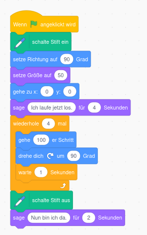 viermal wiederholt. Diese Befehlsfolge kann man in eine Zählschleife „Wiederhole 4 mal“ einbetten. Sie wird dann auch viermal wiederholt.