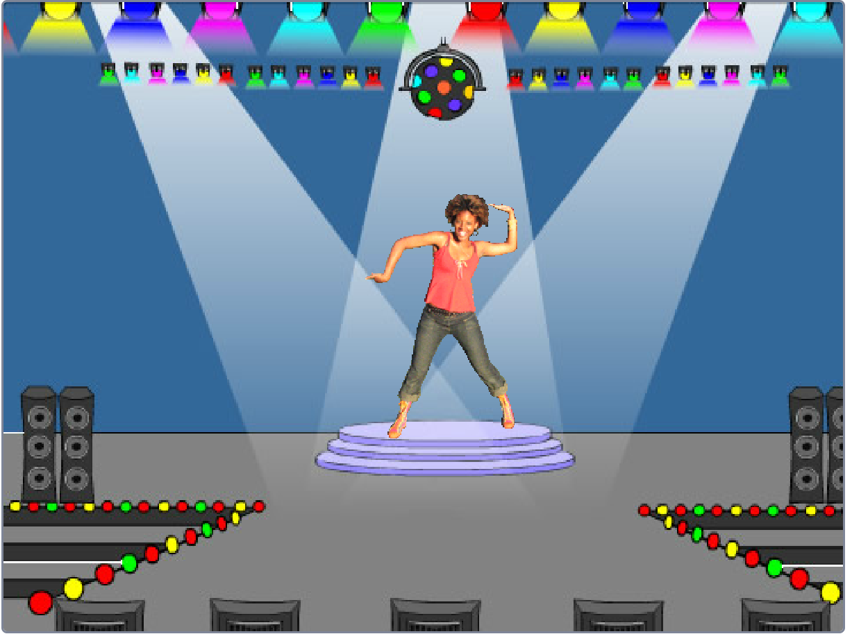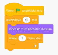 Wir wollen ein Programm schreiben in dem eine Figur tanzt. Wähle eine geeignete Figur und einen geeigneten Hintergrund (z.B. Cassy Dance (Größe 70) und Spotlight). Die Figur soll nun ihr Kostüm wechseln, damit es aussieht, als ob sie tanzt. Dazu wurde das folgende Programm mit einer Zählschleife geschrieben: