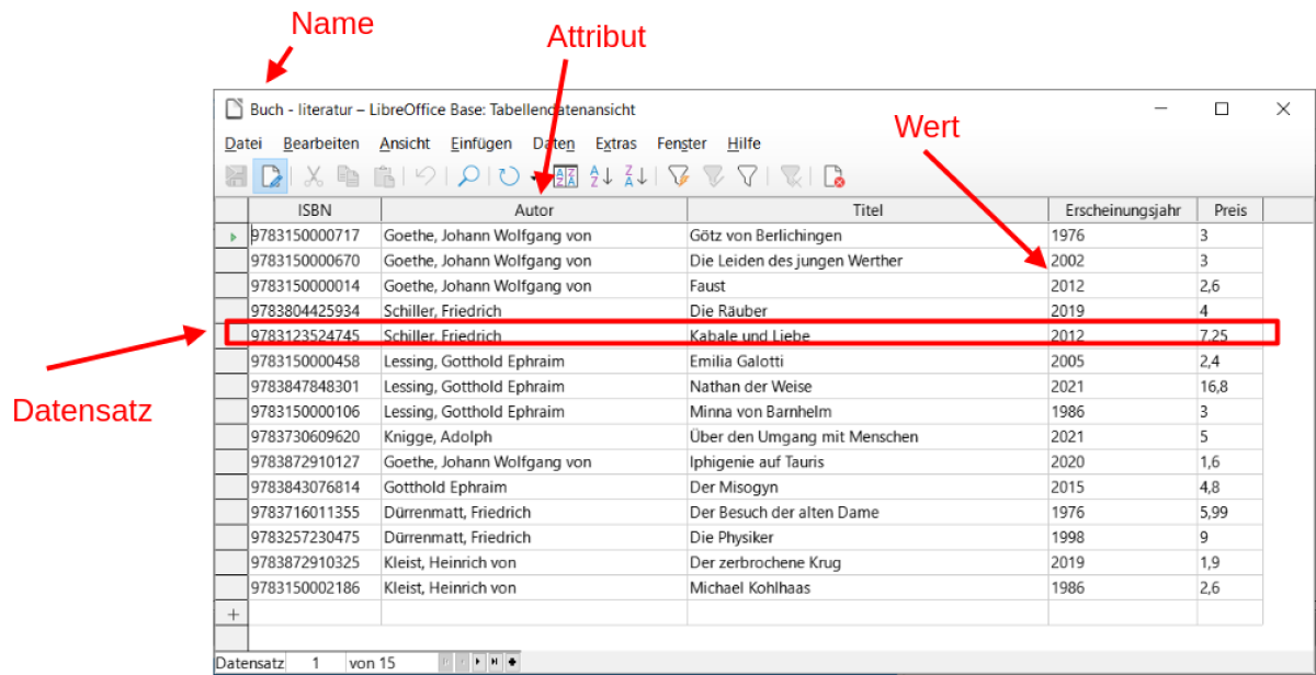 - beliebig viele Zeilen (Datensätze). Jeder Datensatz besitzt Werte in den Attributen.
