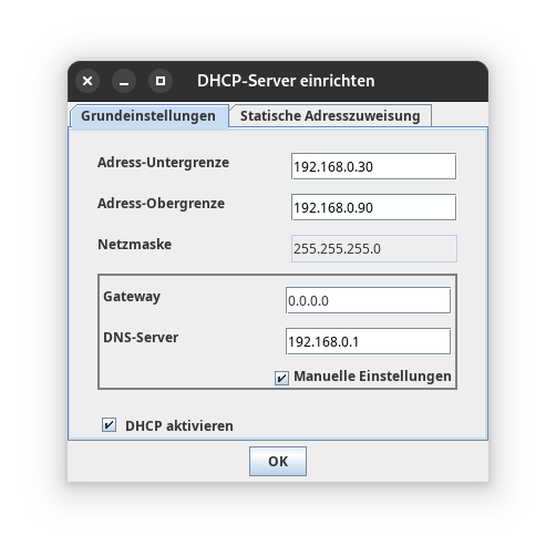 - Setze den Haken bei Manuelle Einstellungen und trage bei DNS-Server 192.168.0.1 ein! (Wird bei der Einrichtung des Domain Name Systems weiter unten behandelt!)!