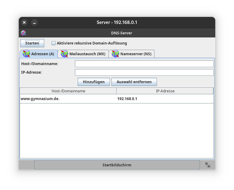 - Öffne den DNS-Server, trage bei Host-/Domainname www.gymnasium.de und bei IP-Adresse 192.168.0.1 (steht meist schon drin) ein! Klicke auf „Hinzufügen“!