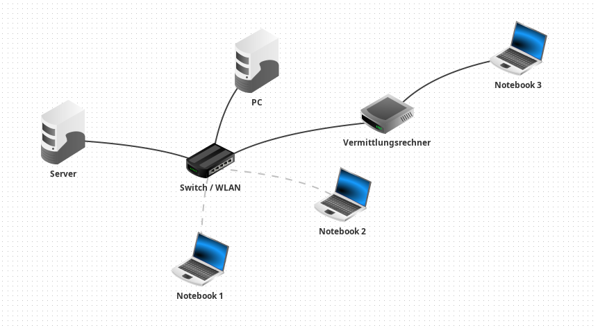 Wir wollen nun ein weiteres Netzwerk hinzufügen in dem sich nur ein einziger Rechner (Notebook 3) befindet. Dieses Netzwerk soll dann über einen Vermittlungsrechner (Router) mit unserem Netzwerk verbunden werden. Im Vermittlungsrechner soll die Kommunikation gesteuert werden.