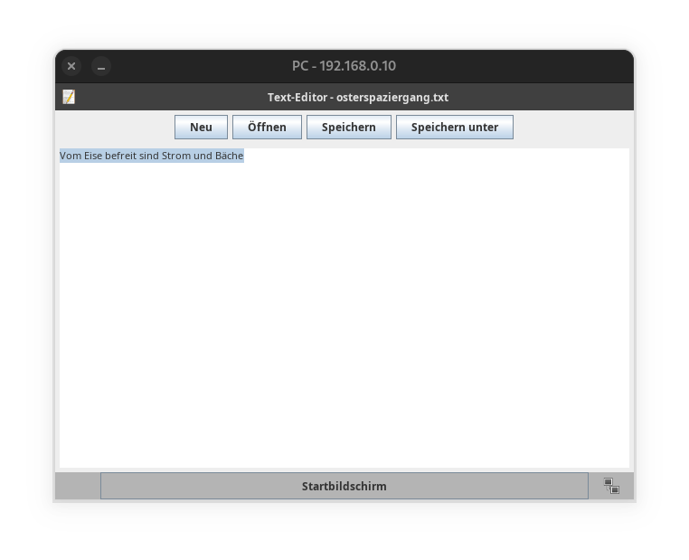 - Öffne auf dem PC eine Textdatei, schreibe den Text „Vom Eise befreit sind Strom und Bäche“ und speichere sie unter osterspaziergang.txt im Ordner peer2peer ab!