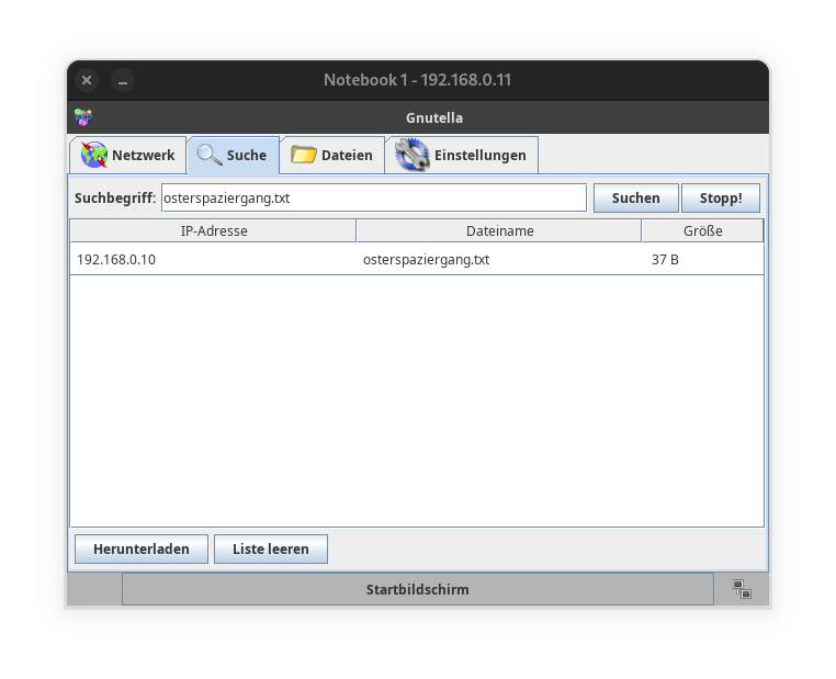 - Gehe auf Notebook 1 in Gnutella auf Suche, suche nach osterspaziergang.txt und lade die Datei herunter!