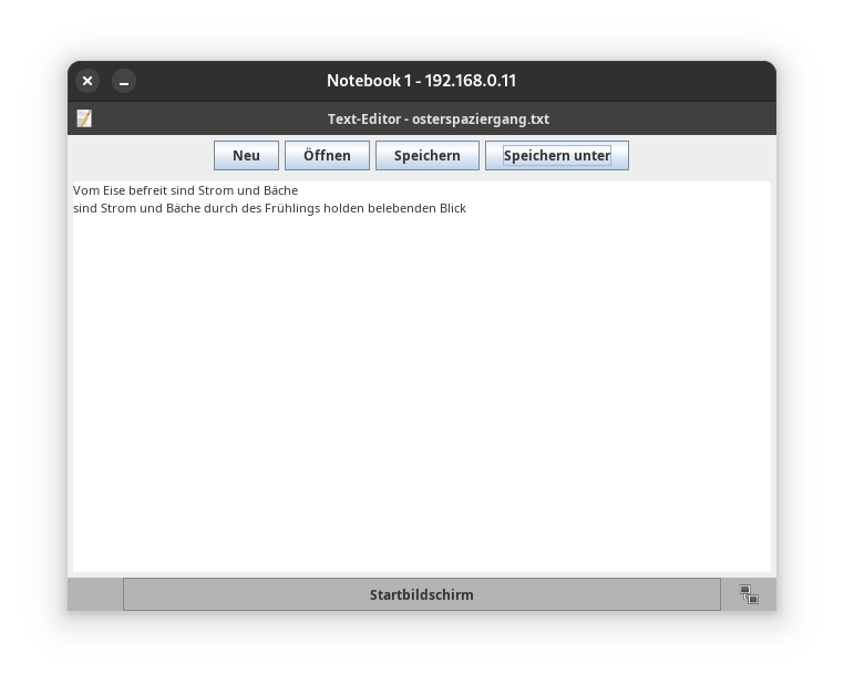 - Öffne die Datei auf dem Notebook 1 im Texteditor und ergänze „sind Strom und Bäche durch des Frühlings holden belebenden Blick“. Speichere die Datei wieder ab.