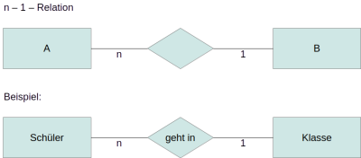 Ein Beispiel für eine n-1-Relation ist die Beziehung „lernt in“ zwischen der Entitätsmenge „Schüler“ und der Entitätsmenge „Klasse“. Ein Schüler lernt in genau einer Klasse. In einer Klasse lernen mehrere Schüler.