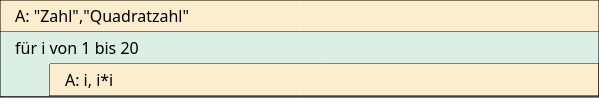 # Beispiel 2 print("Zahl","Quadratzahl") for i in range(1,21): print(i,"\t",i*i)