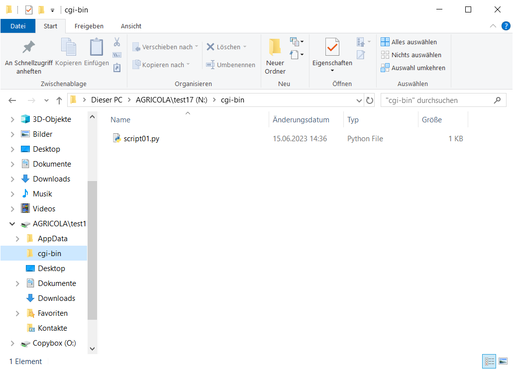 Zunächst erzeugen wir ein Verzeichnis cgi-bin und kopieren das Script hinein. In unserem Fall wurde das Verzeichnis cgi-bin direkt auf dem Laufwerk N: erzeugt.