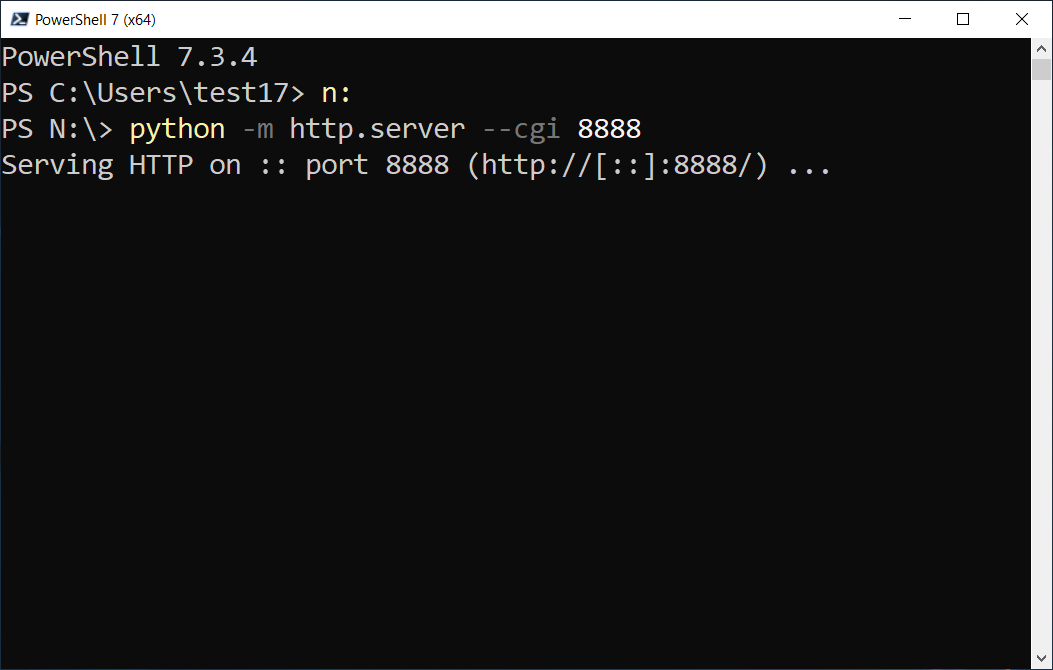 Anschließend öffnen wir die Powershell und wechseln ins übergeordnete Verzeichnis von cgi-bin, also in unseren Fall direkt ins Laufwerk N:.