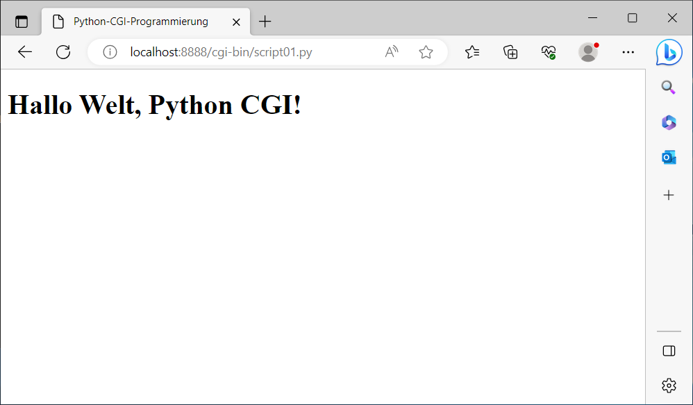 Jetzt können wir unser Script im Webbrowser mit http://localhost:8888/cgi-bin/script01.py aufrufen. Dabei ist http://localhost:8888 der lokale Webserver auf dem Port 8888, /cgi-bin/ das Verzeichnis, in dem das Script liegt und script01.py der Name des Scripts.