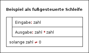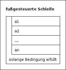 Bei der fußgesteuerten Schleife wird die Schleifenbedingung am Ende der Schleife getestet. Die Schleife wird immer wieder durchlaufen, solange die Bedingung erfüllt ist. Wenn die Bedingung beim Eintritt nicht erfüllt, wird die Schleife mindestens einmal durchlaufen.