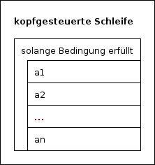 Bei der kopfgesteuerten Schleife wird die Schleifenbedingung am Anfang der Schleife getestet. Die Schleife wird immer wieder durchlaufen, solange die Bedingung erfüllt ist. Wenn die Bedingung beim Eintritt nicht erfüllt, wird die Schleife nicht durchlaufen.